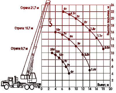 Стреловой кран КС-54711Б обладает высокими грузовысотными характеристиками, особенно при работе на средних и дальних вылетах.